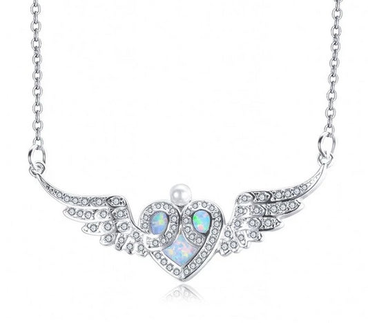 925 Sterling Silver White and Blue Fire Opal Heart with Angel Wings Pendant Necklace