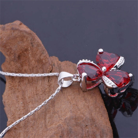 925 Sterling Silver Three Red Heart Clover Pendant Necklace