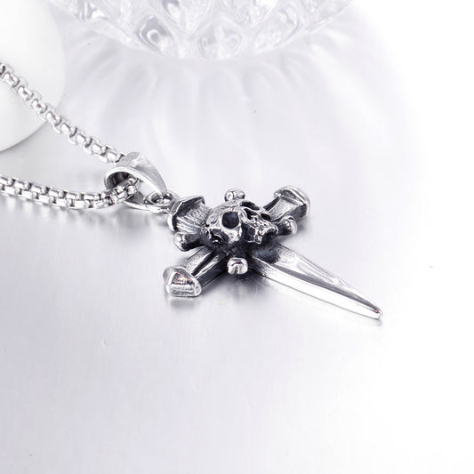 Stainless Steel Skull on a Sword Cross Pendant Necklace