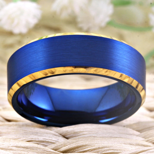 8mm Blue Brushed Matte and Gold Tungsten Carbide Wedding Ring