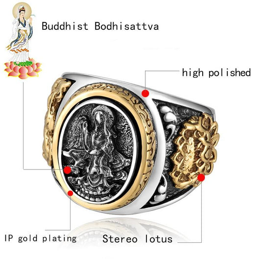 925 Sterling Silver Buddhism Goddess with Dragon Ring Men’s Jewelry