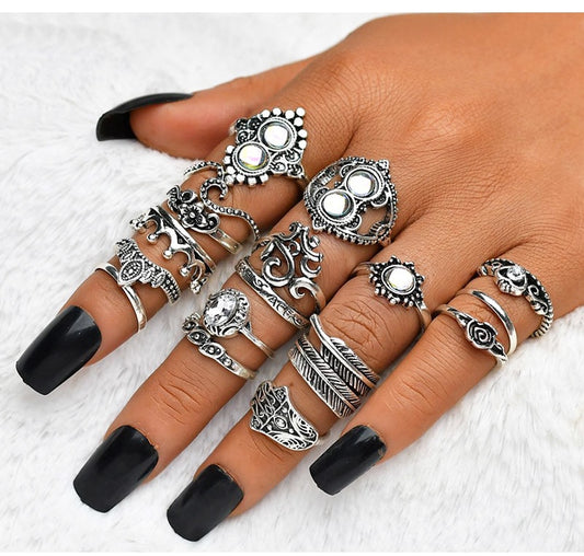 Bohemian Style Antique Silver Themed Women Knuckle Midi 16 Pcs Rings Set