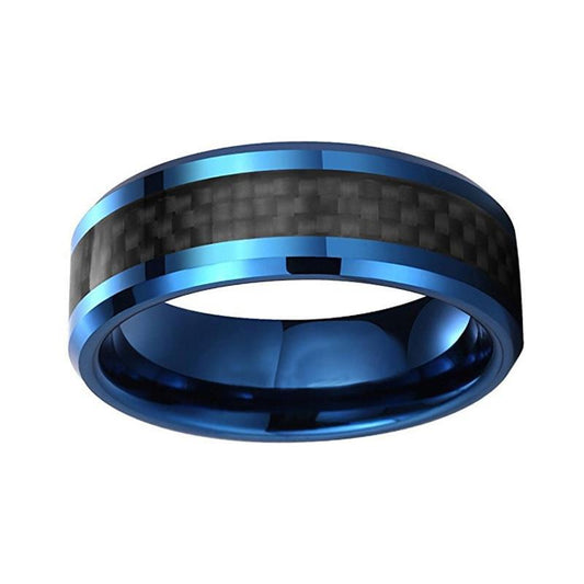 8mm Blue Coated Tungsten Carbide with Elegant Black Basket Weave Pattern Inlay Ring