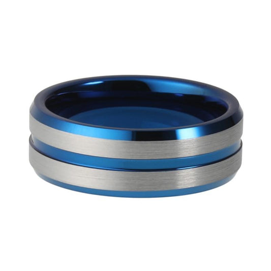 8mm Blue Tungsten with Blue Groove and Silver Brushed Surface Wedding Ring
