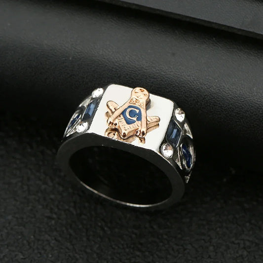 Silver Plated Masonic Ring for Men with Gold Mason Builder Symbol and Two Blue Square Rhinestones
