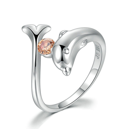 18K White Gold Plated Ring with Dolphin and Cubic Zirconia Stone