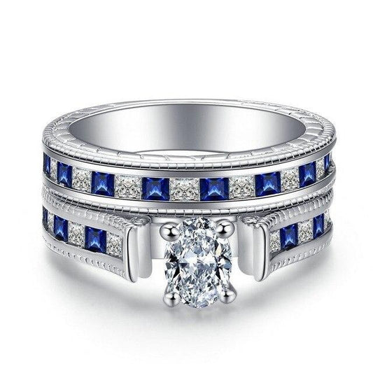 His & Hers Matching Ring Set - Zirconia and Blue & Black Inlay Tungsten Carbide