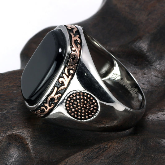 Natural Black Onyx Stone Rose Gold Plated 925 Sterling Silver Turkish Vintage Ring